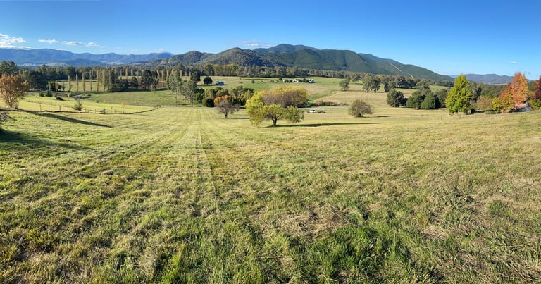 In 2016, Kylie and I purchased a six acre parcel of land just a couple of minutes from Myrtleford in North East Victoria. At the time it was infested with blackberries but ticked all our boxes; a rural lifestyle, north facing sloping block (8 - 25 degrees) with a wonderful view. It was also an opportunity for us to build a home and be more self sufficient, sustainable and for me to practice farming again; alas on a much smaller scale.
